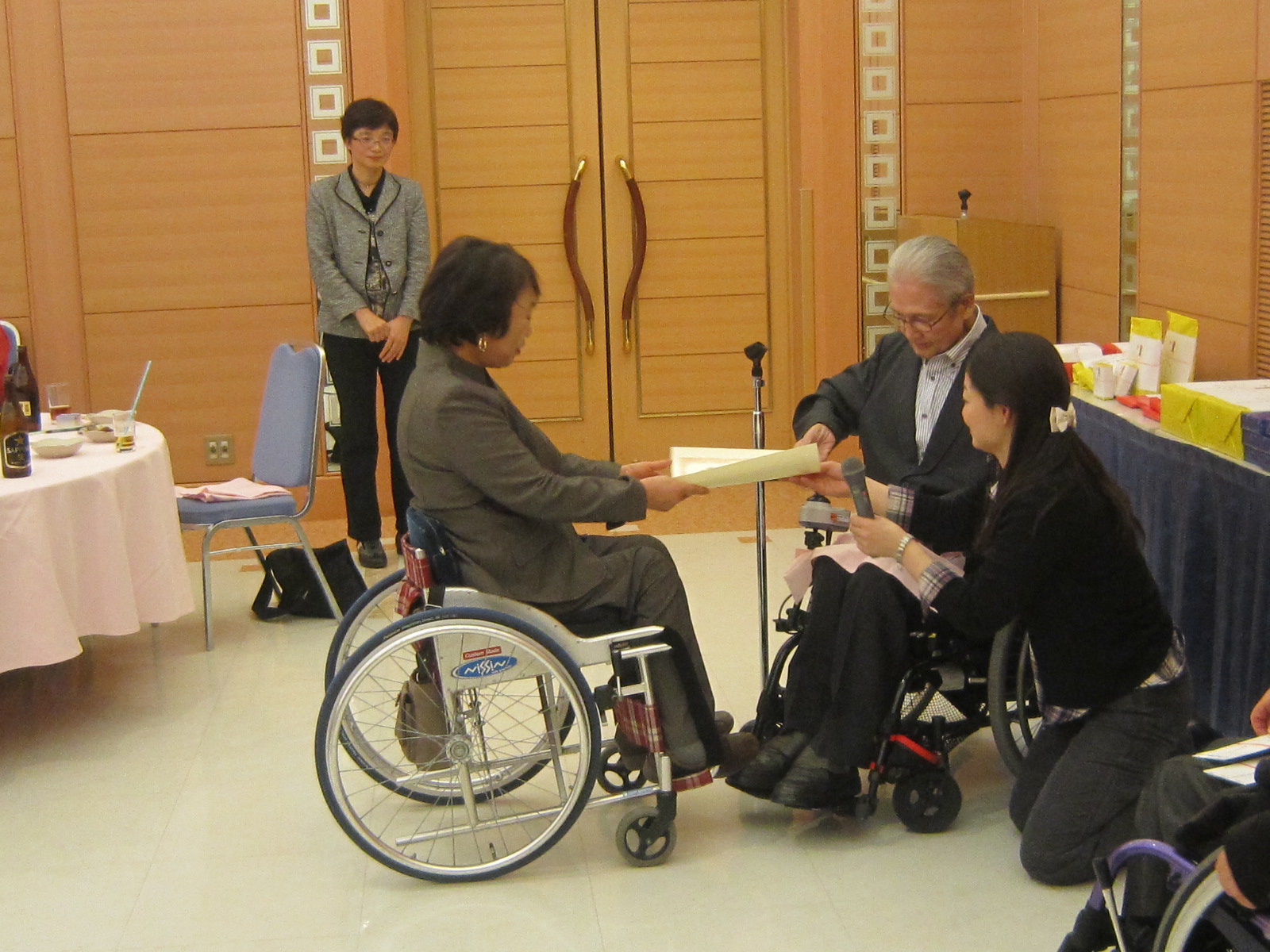 支部忘年会の中では、平成26年6月に開催された第13会総会神奈川県大会で表彰された千葉県支部功労者の大塚恵美子氏(千葉県千葉リハビリテーションセンター)、鳥海三千代氏(千葉県支部会員)への感謝状贈呈式を行いました。